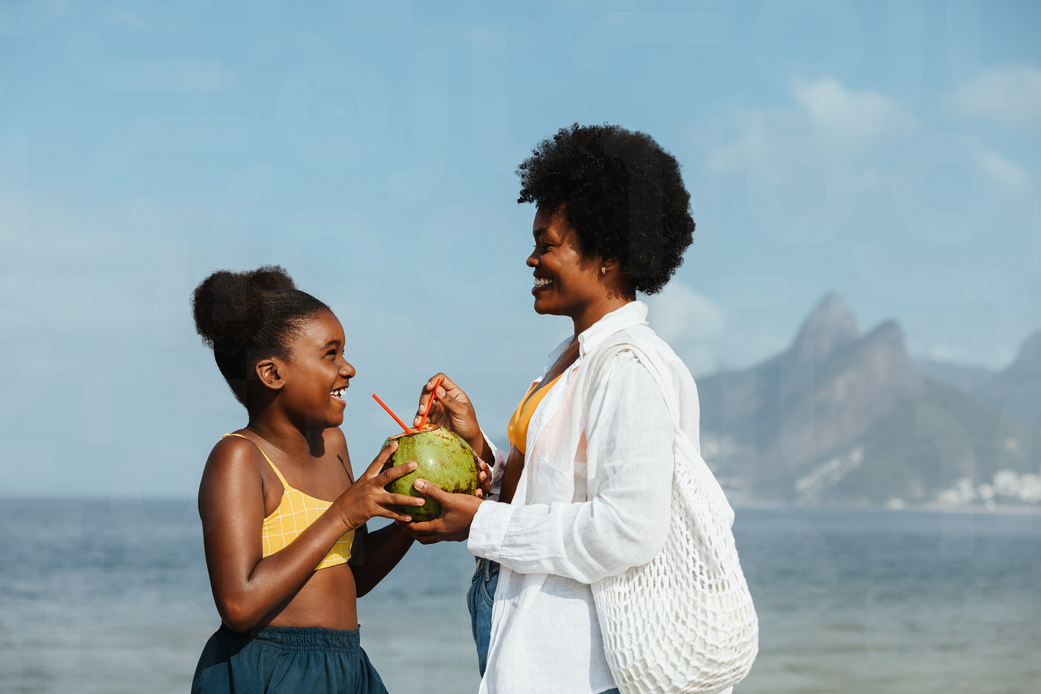 A joyful mother and daughter share a refreshing coconut drink on the sunny shores of Ipanema Beach. The scene captures their strong bond and happiness during a carefree day by the ocean.