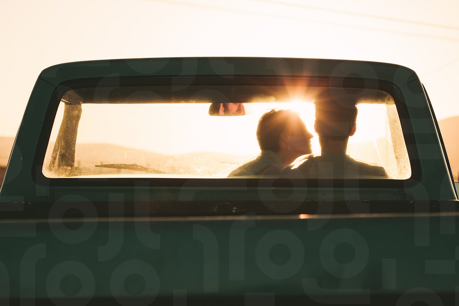 Rear view of couple sitting inside their pick up truck. Woman trying to kiss the man sitting inside the car.