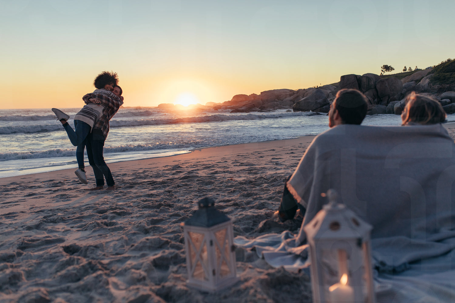 Couple hugging at the beach with people sitting at the front. Man embracing and lifting his girlfriend with love at the sea shore.