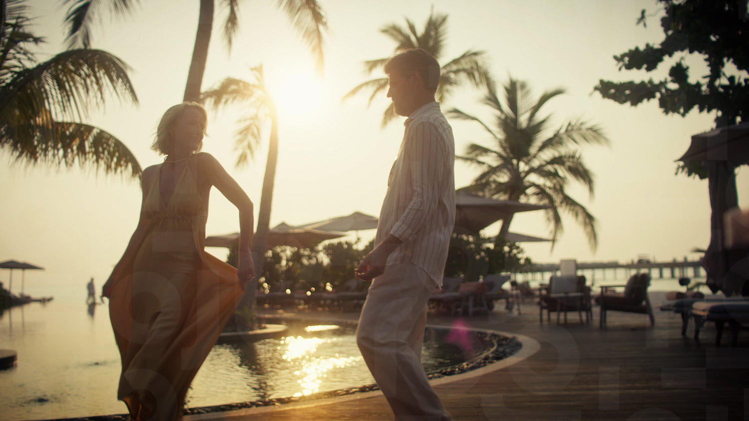 Mature couple dancing gracefully by the pool at a tropical resort during sunset