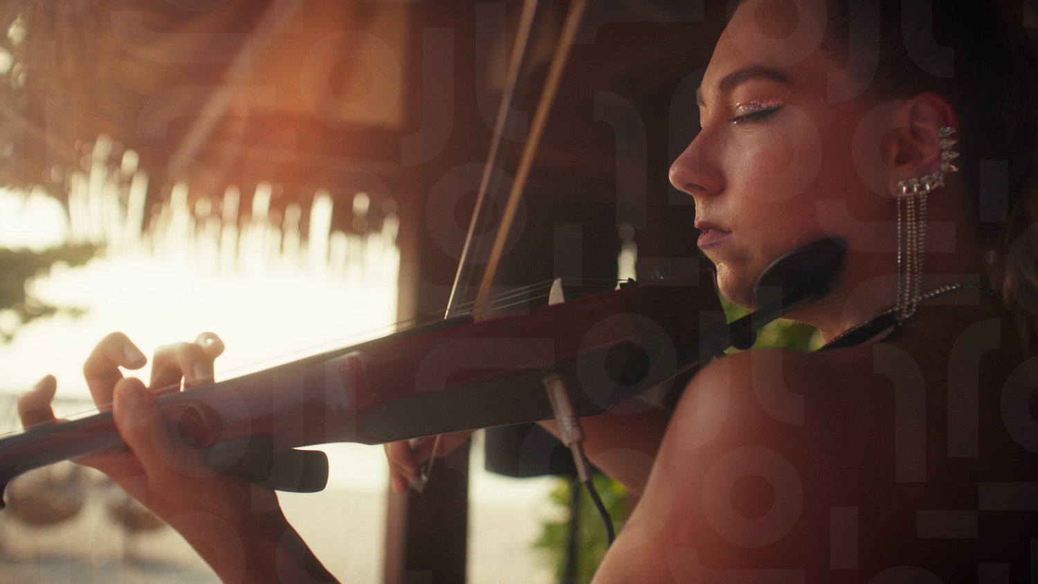A skilled young woman performs on an electric violin outdoors at sunset, surrounded by a tropical resort setting. The elegant golden hour performance evokes serenity, luxury, and artistic expression.