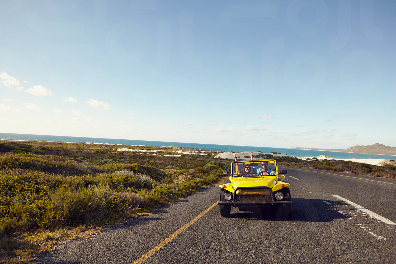 Young couple driving down an open road excited to be on a roadtrip. Happy couple driving a buddy car with their arms raised an a summer day.