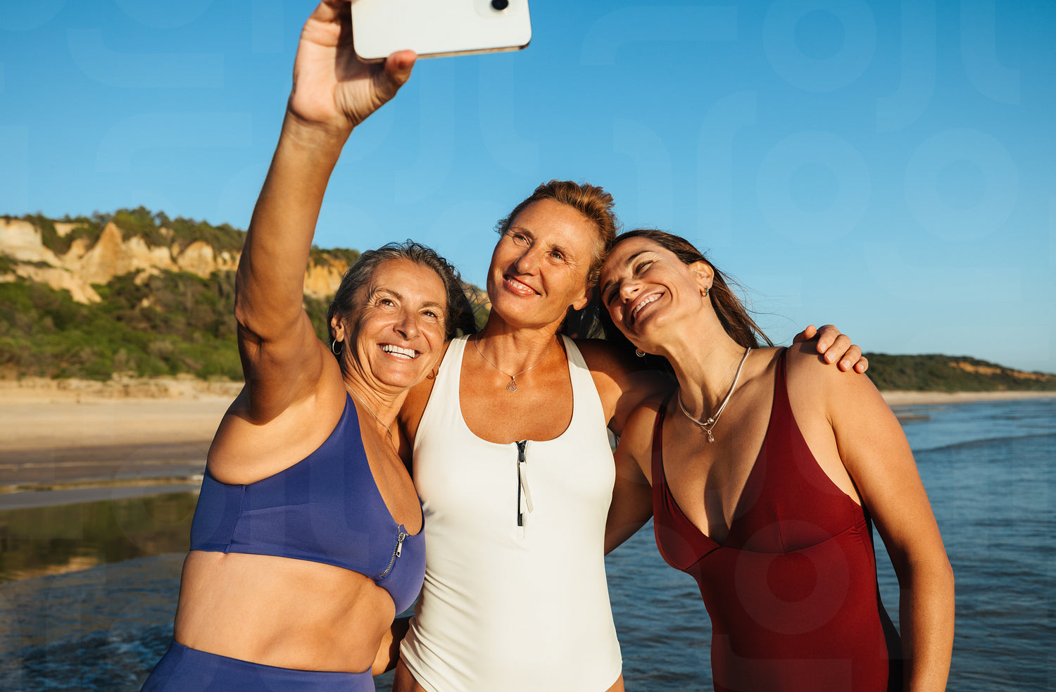 Three smiling women in swimsuits take a fun selfie at the beach during a sunny day, capturing a moment filled with joy, friendship, and memories by the beautiful seaside.