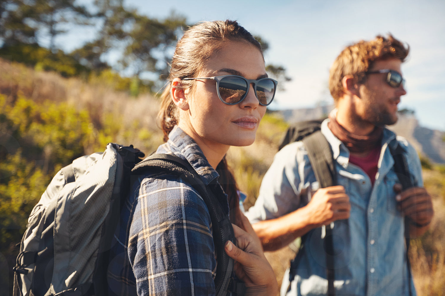 Pretty young woman on a hiking trip with man in the background. Caucasian couple on hike in countryside