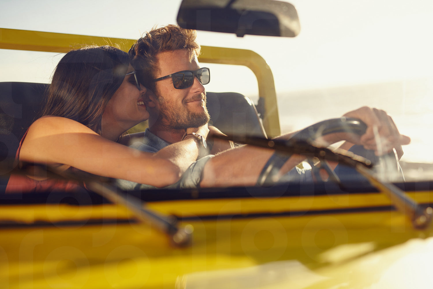 Romantic young couple sharing a special moment while on a road trip. Man driving car with girlfriend.