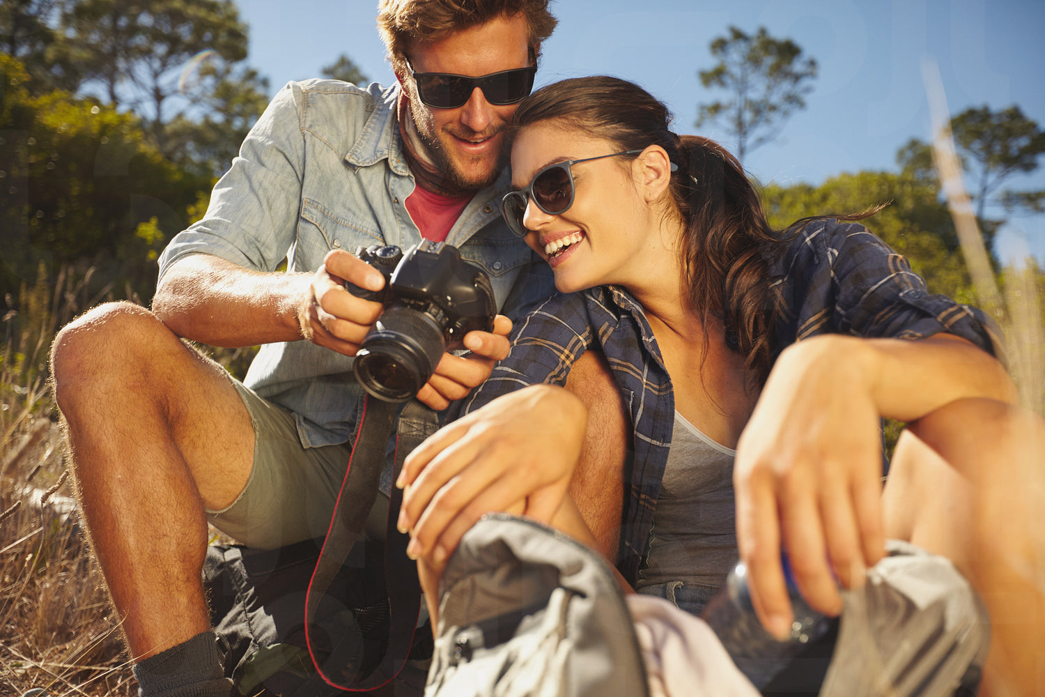 Smiling couple on a hike looking pictures on digital camera