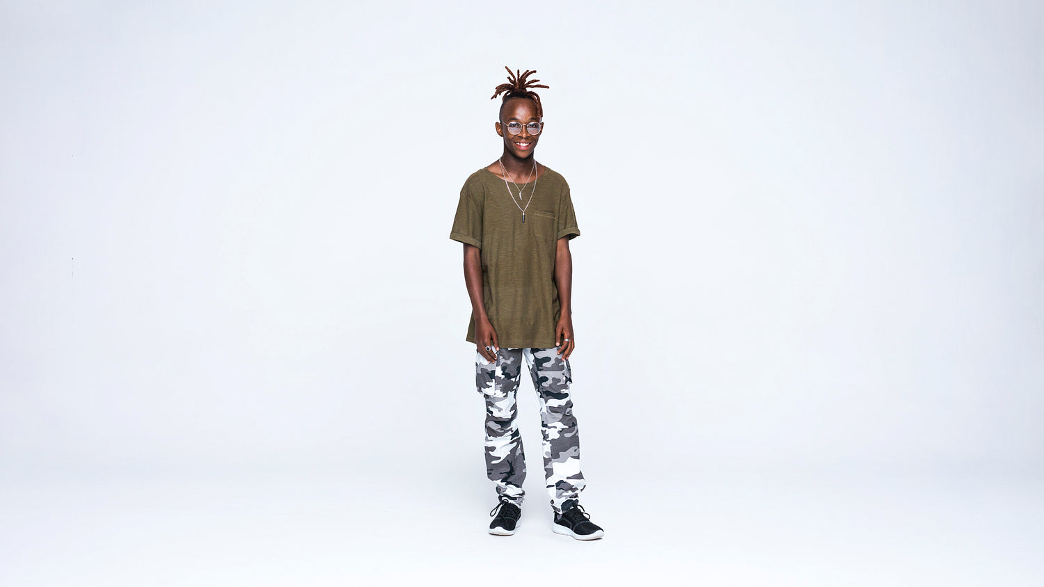 Smiling african man standing isolated on white background. Young man in casual clothes with dreadlocks tied together.