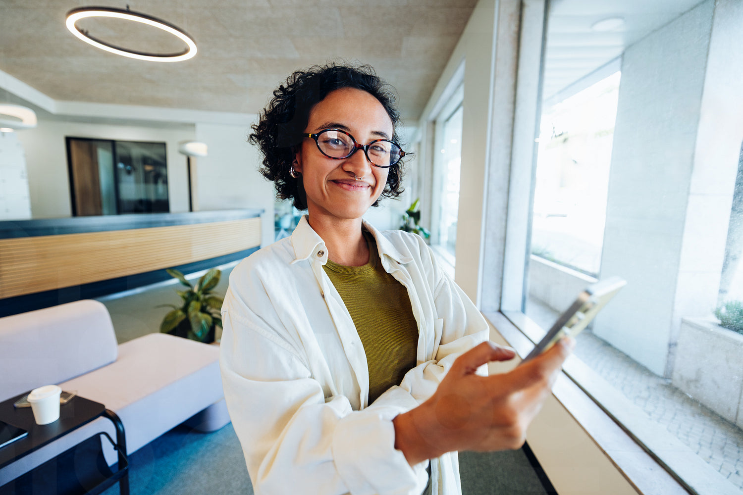 A cheerful woman with glasses holds a smartphone in a modern office lobby, wearing a green top and white shirt. She looks confident, ready to connect with colleagues in a friendly setting.