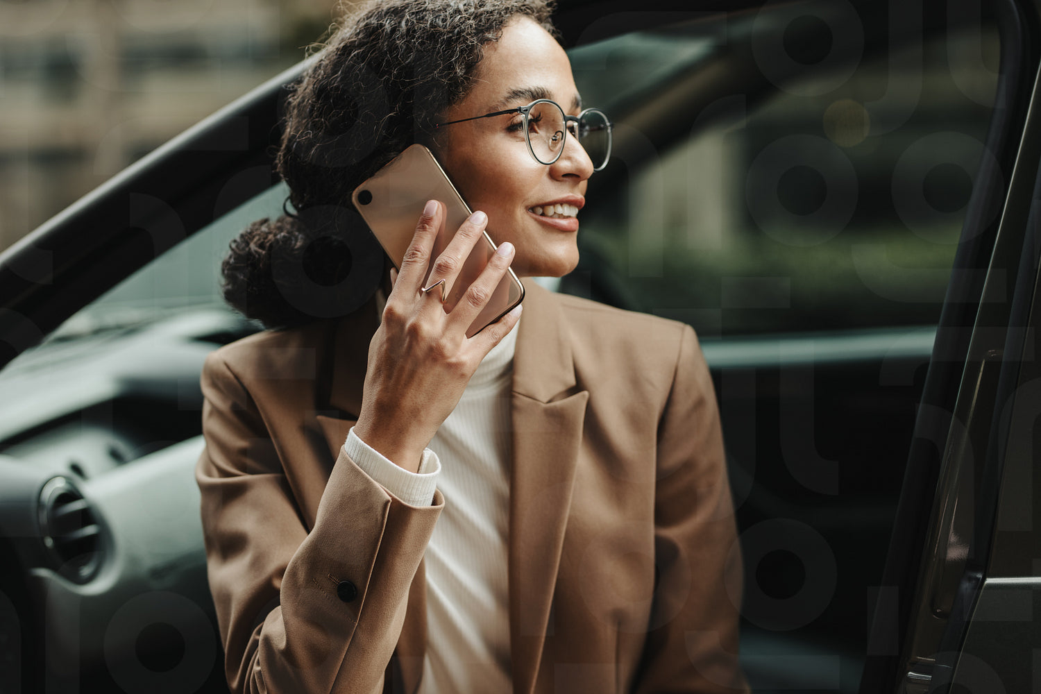 Businesswoman sitting in her car and talking on phone. Woman in businesswear making a phone call while sitting in her car.