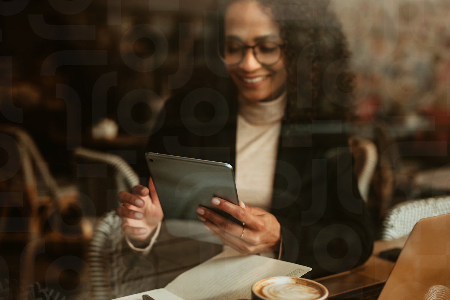 Woman sitting at a coffee shop and using her digital tablet. Female using tablet computer while sitting inside a cafe.