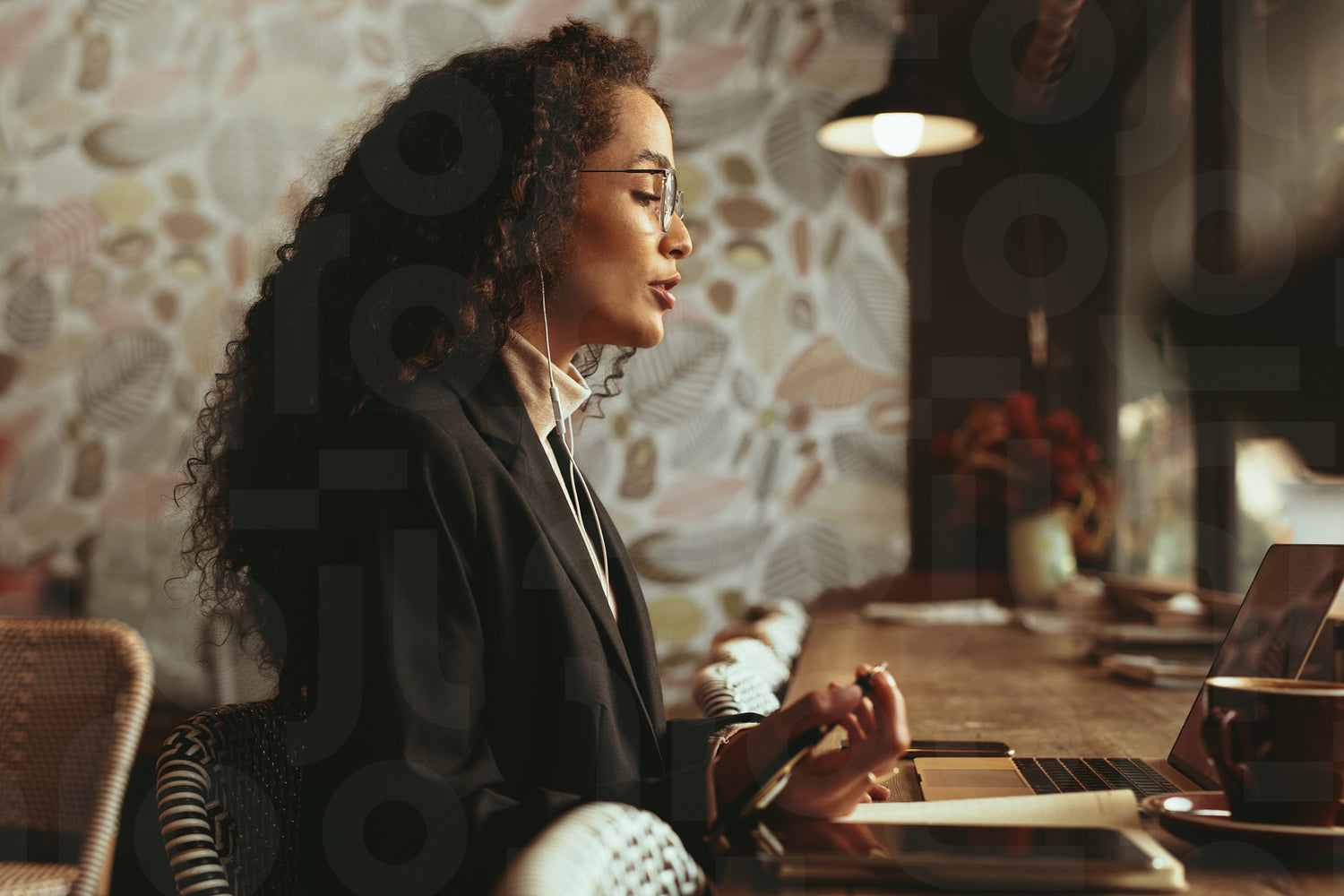 Businesswoman having a video conference on her laptop computer. Side view of a female sitting at cafe having a video chat on her laptop.