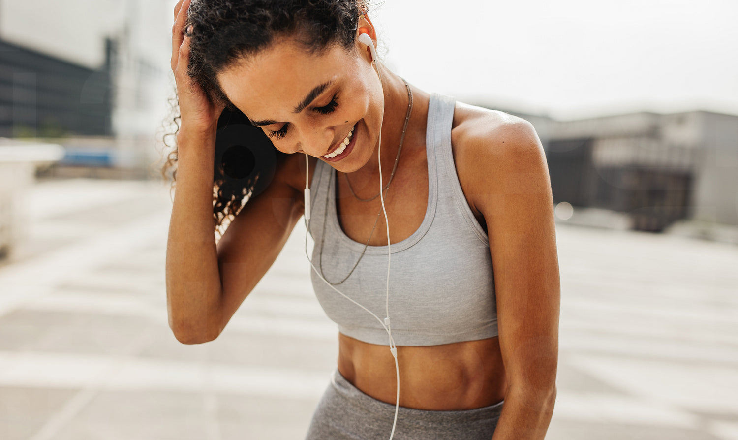 Female runner with earphones standing outdoors and smiling. Woman relaxing after a running workout in the city.