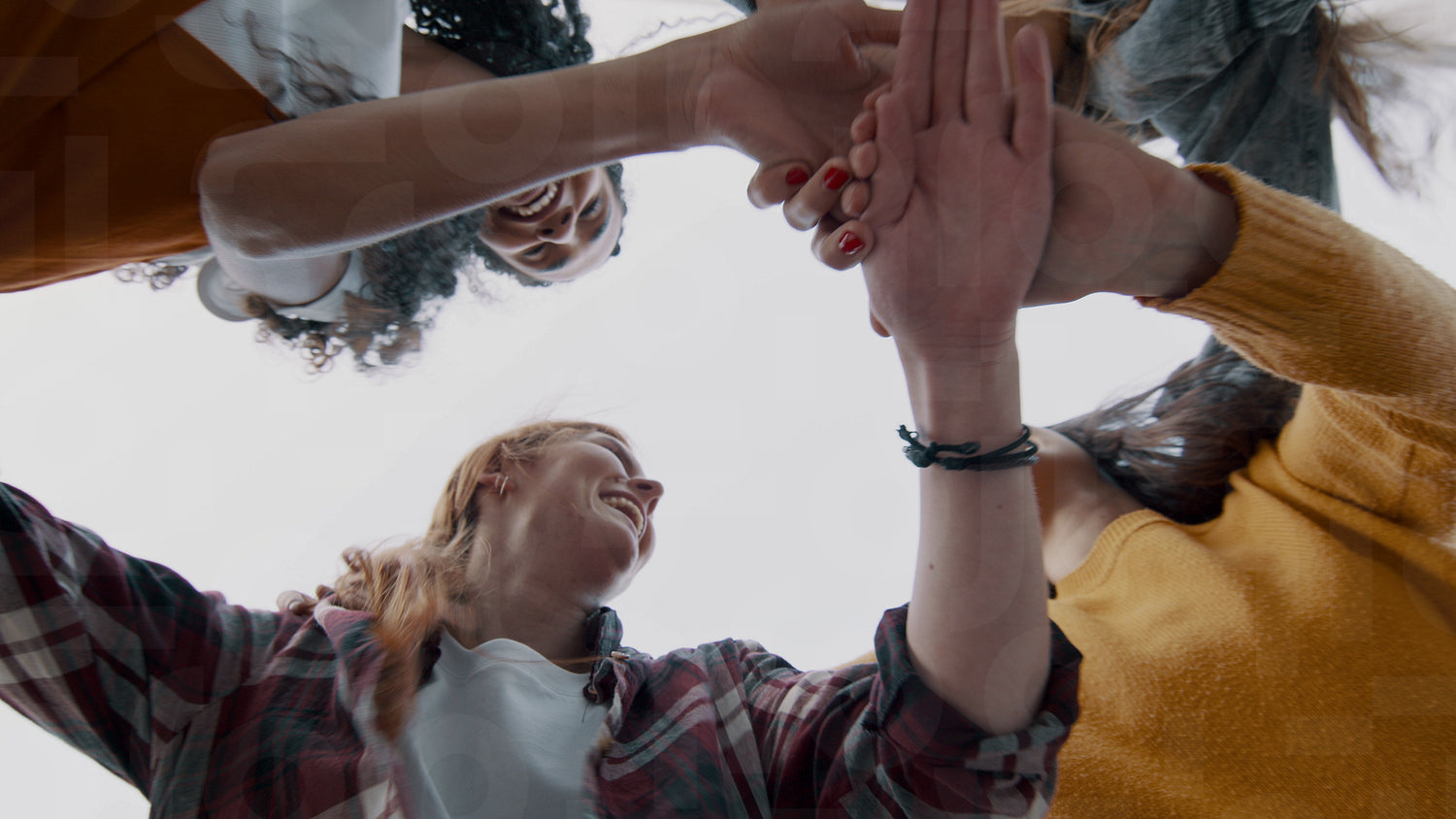 Group of friends joining and lifting hands into the air. Four women having fun outdoors on a weekend.