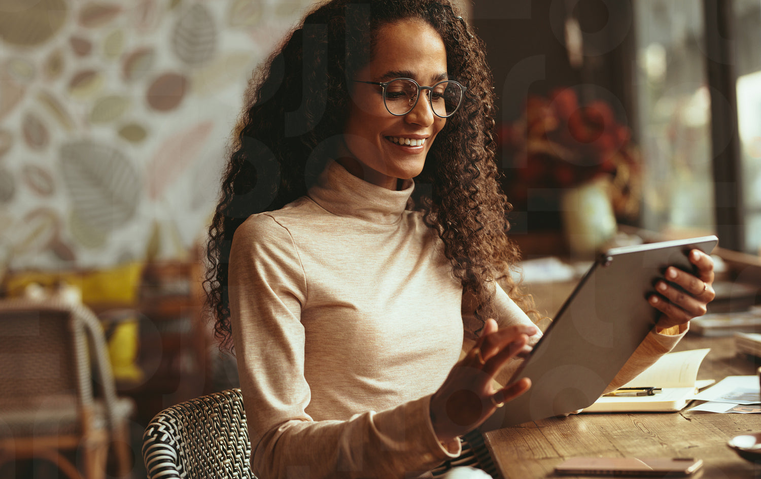 Woman sitting at cafe using her digital tablet. Smiling female in casuals working on her tablet pc from a coffee shop.