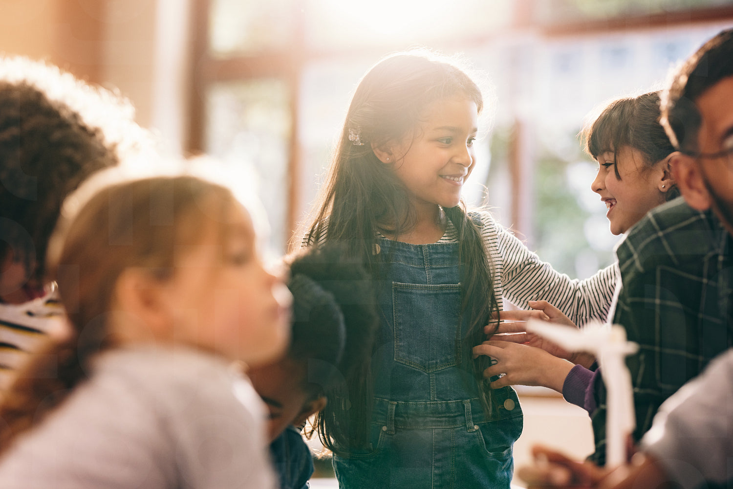 Kids enjoying learning in a primary school class. Group of children smiling and talking to each other in a classroom. Children schooling in a multiethnic education centre.