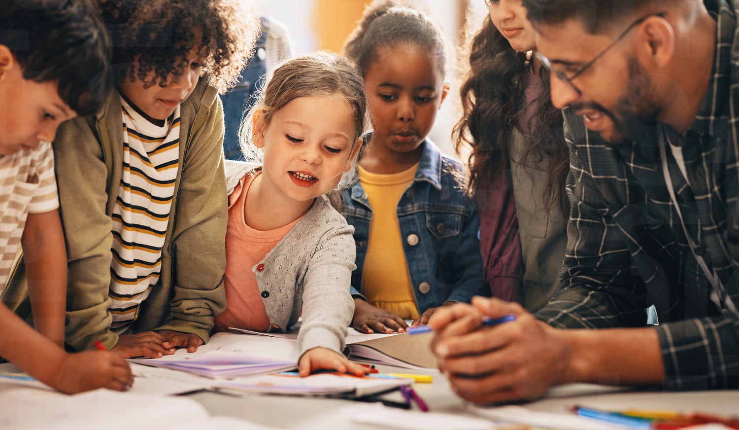 Students doing a creativity project with their teacher in a classroom. Group of primary school children learning how to draw and colour with the help of their educator.