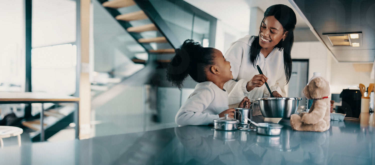 Mother and daughter spending time in the kitchen cooking together. Little child learning how to make food from her mom. Happy family spending quality time at home.