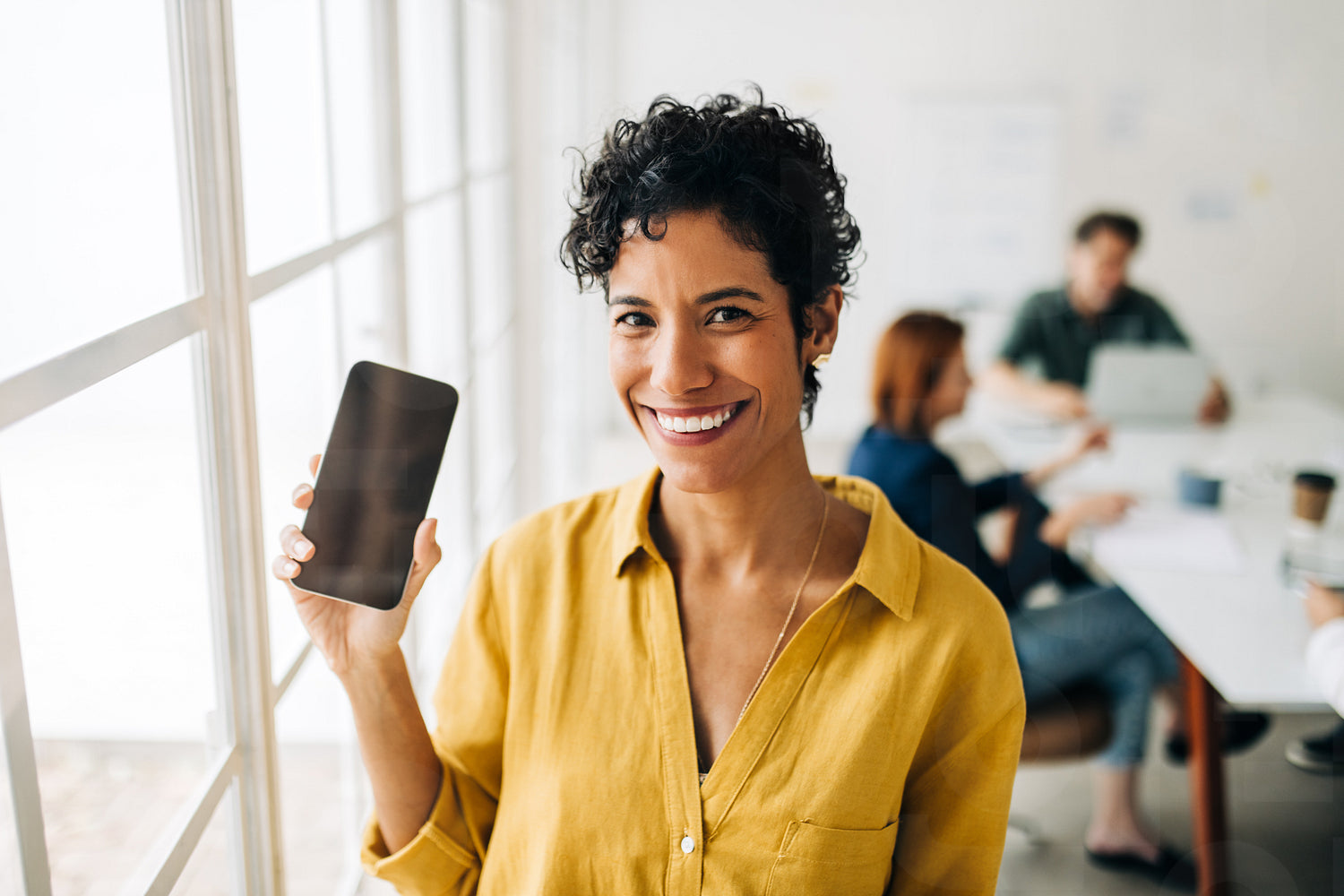 Business woman holding up a mobile phone and smiling at the camera. Successful woman recommending the use of wireless technology in the workplace.