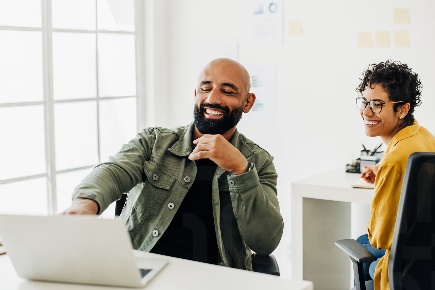 Software developer showing his colleague his work on a laptop. Happy business man discussing his project with a colleague in an office. Young business professional working in tech.