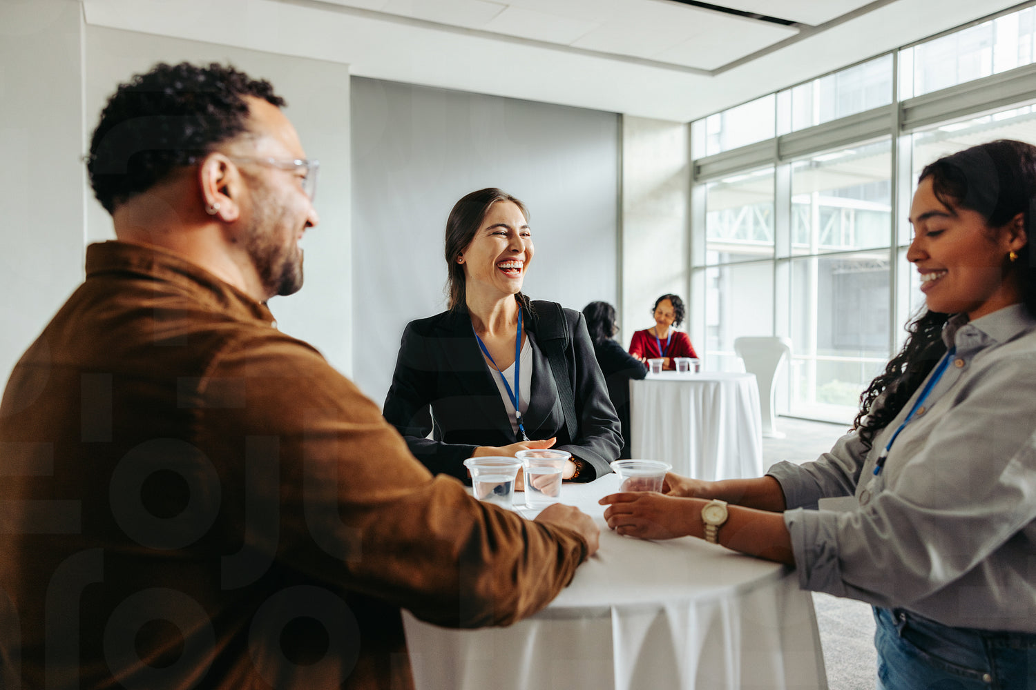 Colleagues enjoying refreshments and conversation at a conference during a break