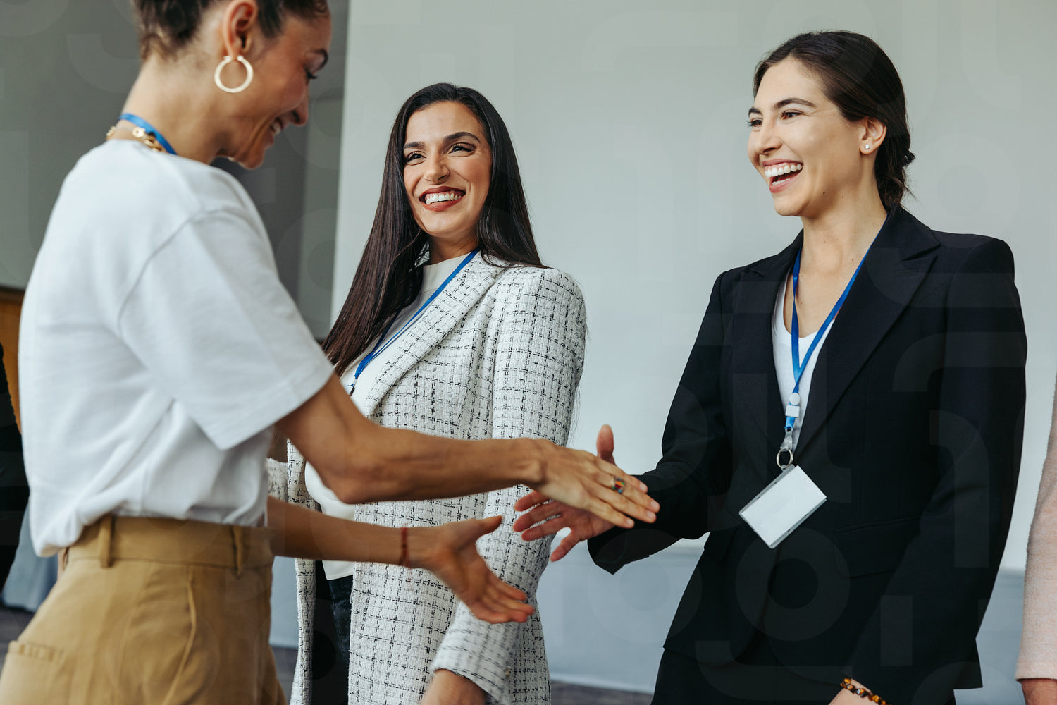 Female colleagues congratulating each other with joyful smiles in a professional setting. Celebrating success and teamwork in a corporate environment.