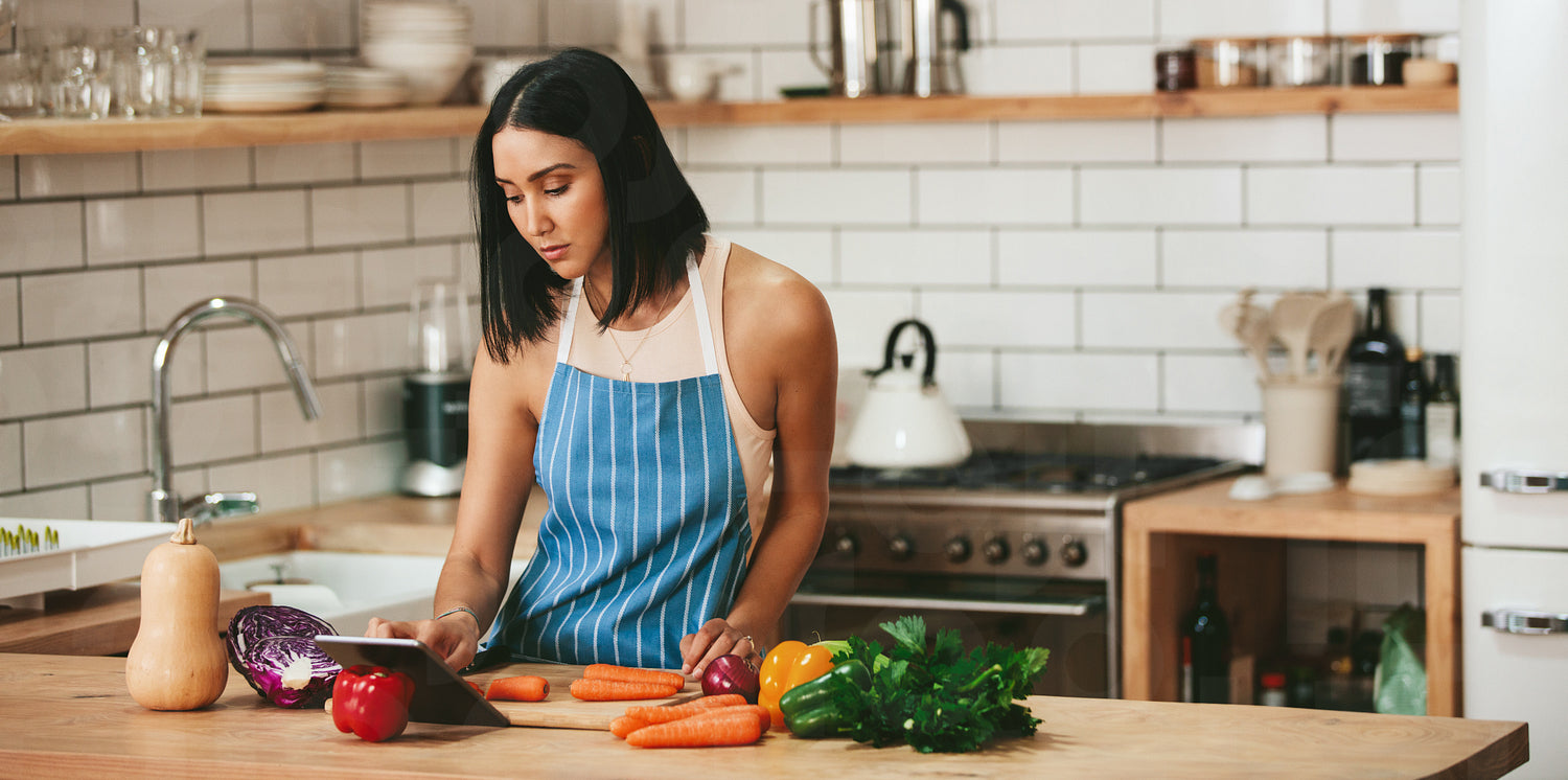 Indoor shot of beautiful young woman watching recipe on the digital tablet and cooking food in kitchen