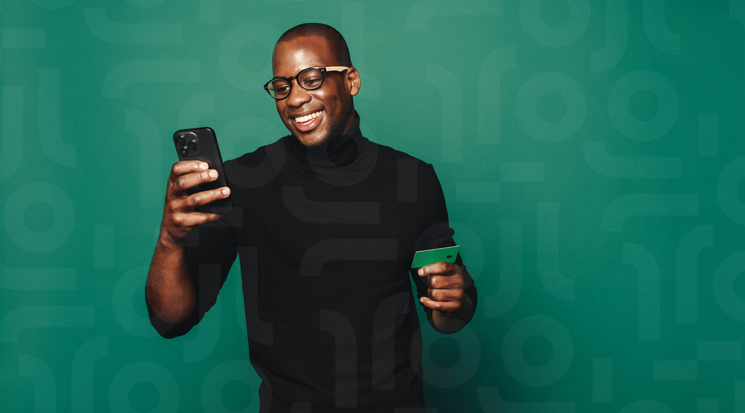 Happy young man, clad in trendy casual attire and glasses, stands against a vibrant green background. Holding a sleek green credit card and smartphone, he portrays a stylish, eco-friendly lifestyle.