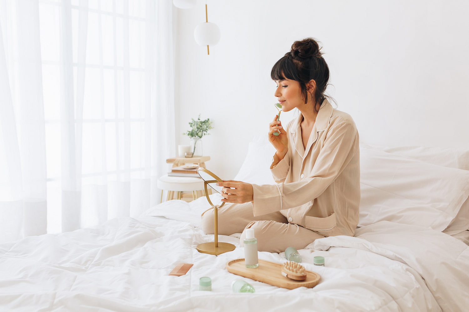Young woman doing a facial massage using a roller. Woman sitting on bed with cosmetics and mirror doing facial.