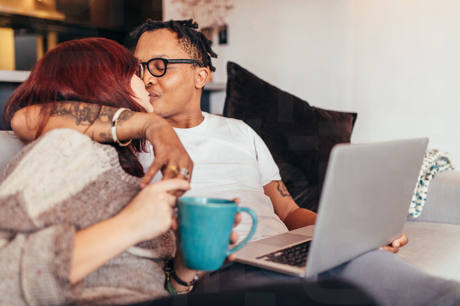 Young mixed race couple sitting on the sofa with laptop and kissing. Romantic couple spend time together at home in living room.