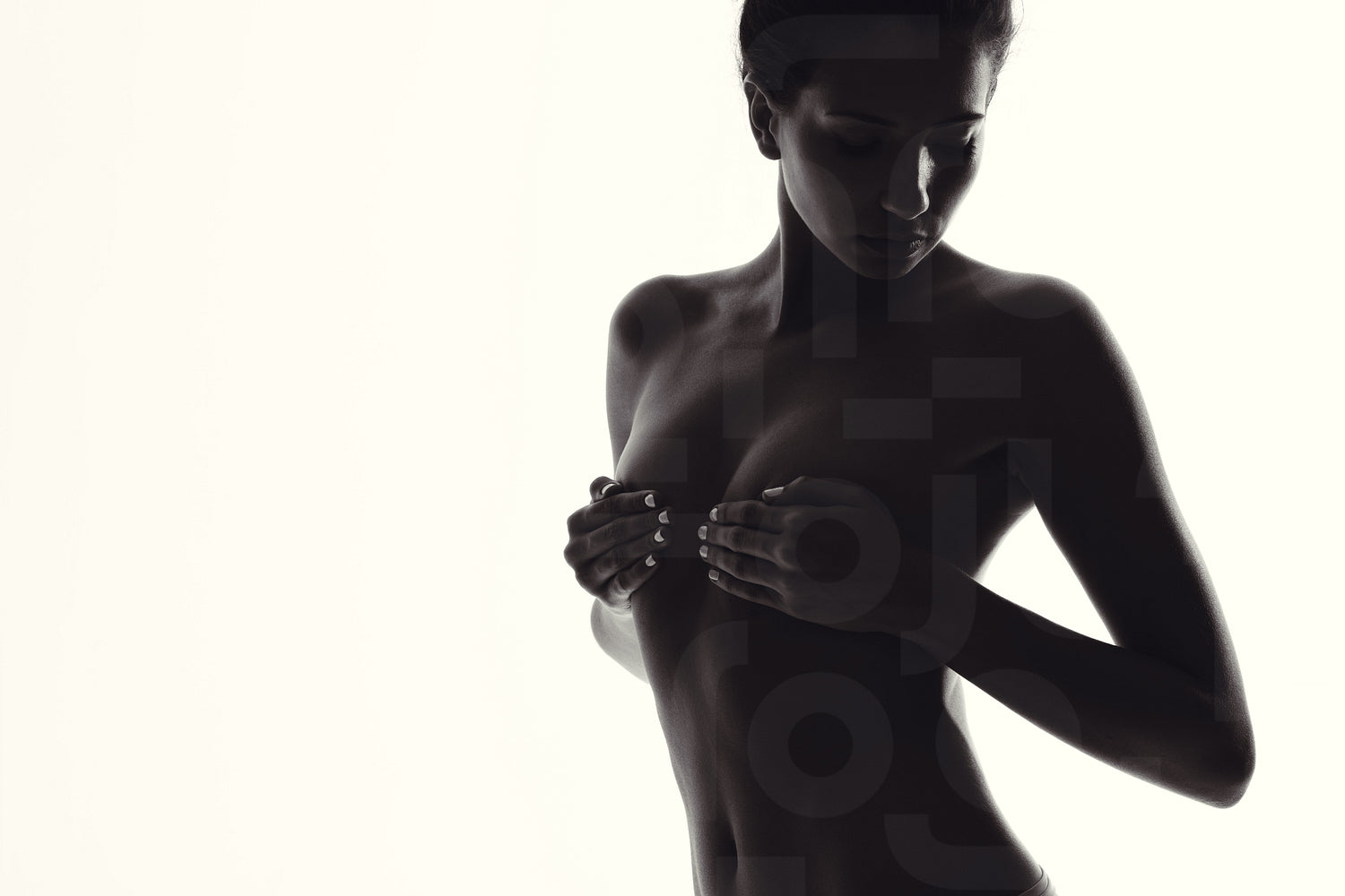 Silhouette of woman with hands covering breast standing against white background. Sensual female covering her breast.