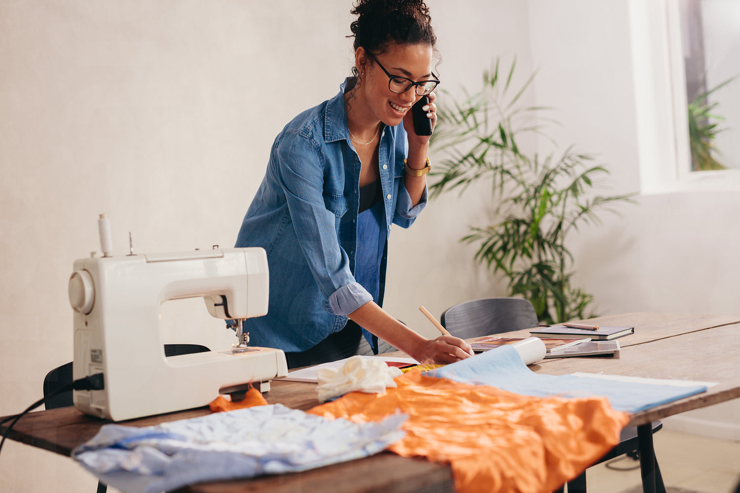 Woman tailor receiving an order of masks at home. Woman working at home talking on the phone with her customer.