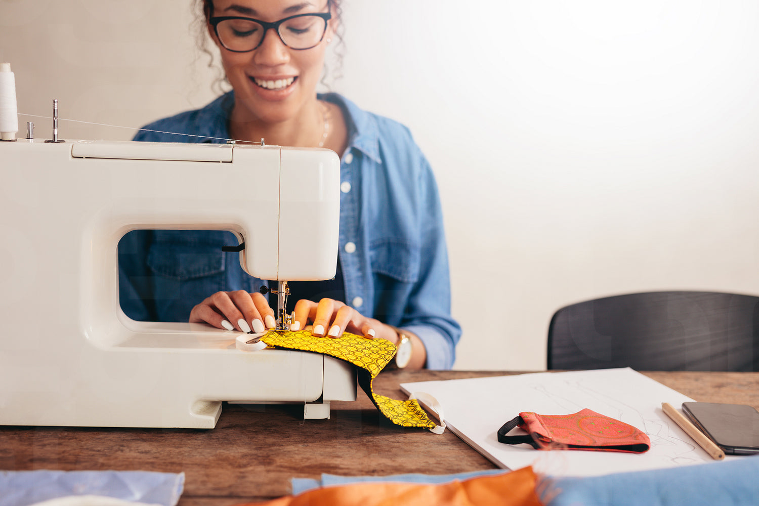 Woman working with sewing machine doing homemade medical face mask for preventing and stop corona virus spreading.