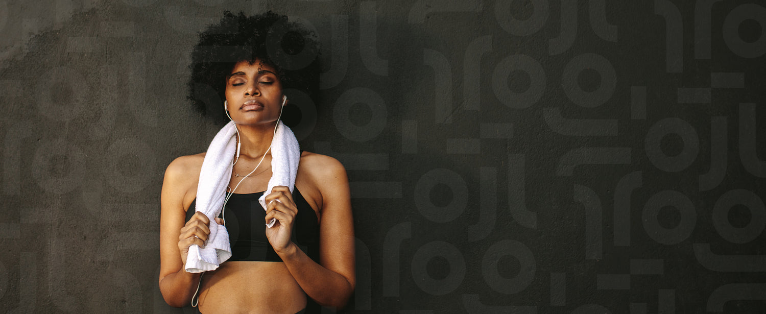 Fit young african woman with towel around her neck leaning to grey wall and listening to music. Female athlete resting after workout.