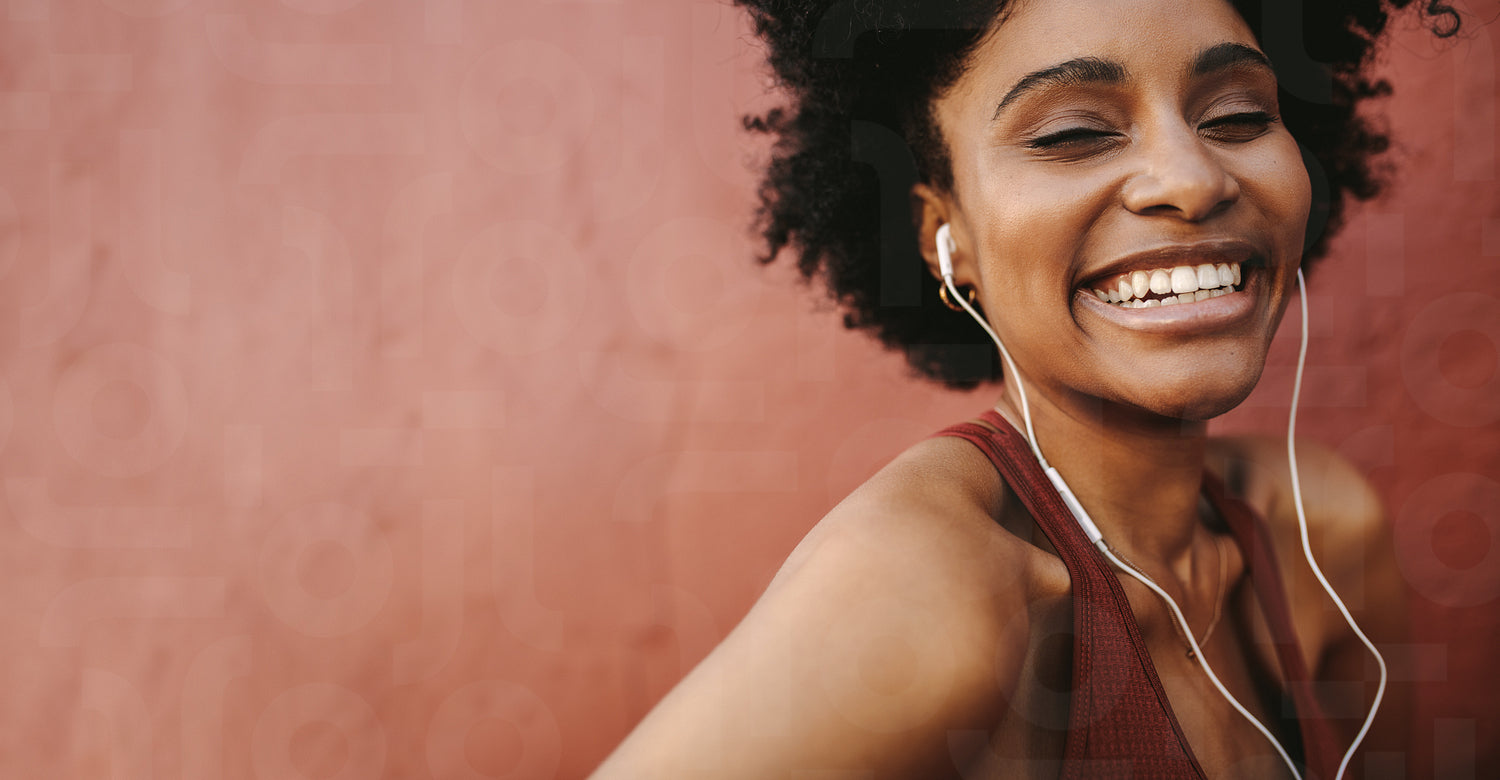 Happy female runner smiling against brown background. African female with earphone smiling after workout.