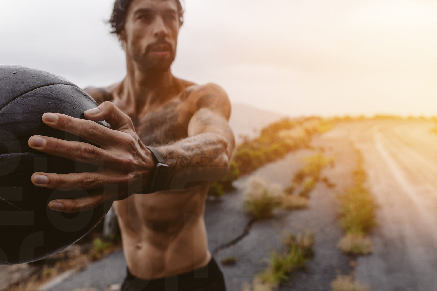 Fit young man exercising with medicine ball outdoors on mountain road. Athlete workout out outdoors on a rainy day.