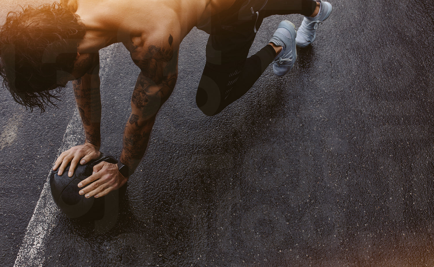 Top view of man doing push ups with a medicine ball on wet road. Athlete exercising with a fitness ball outdoors.