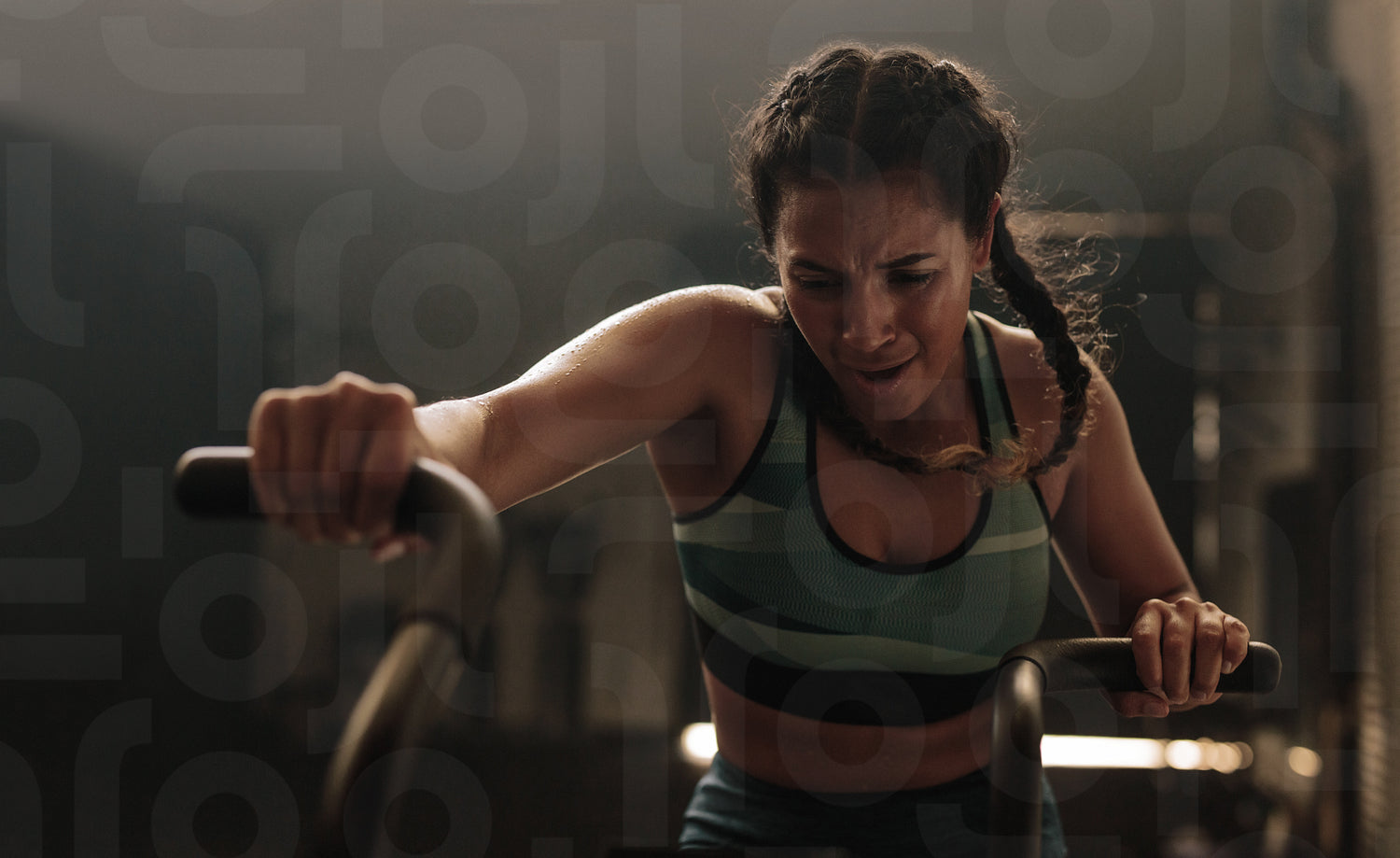 Fitness woman on gym bicycle doing exercise. Female putting full effort while exercising on gym air bike.