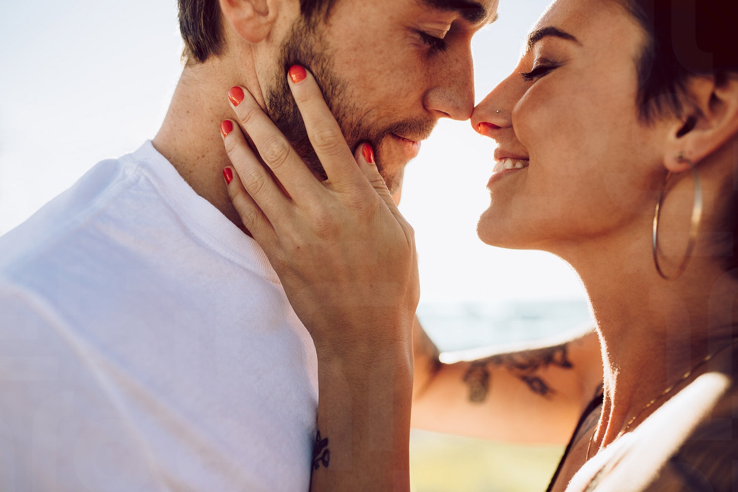 Close up of romantic young couple together outdoors. Loving man and woman caught in a romantic moment.