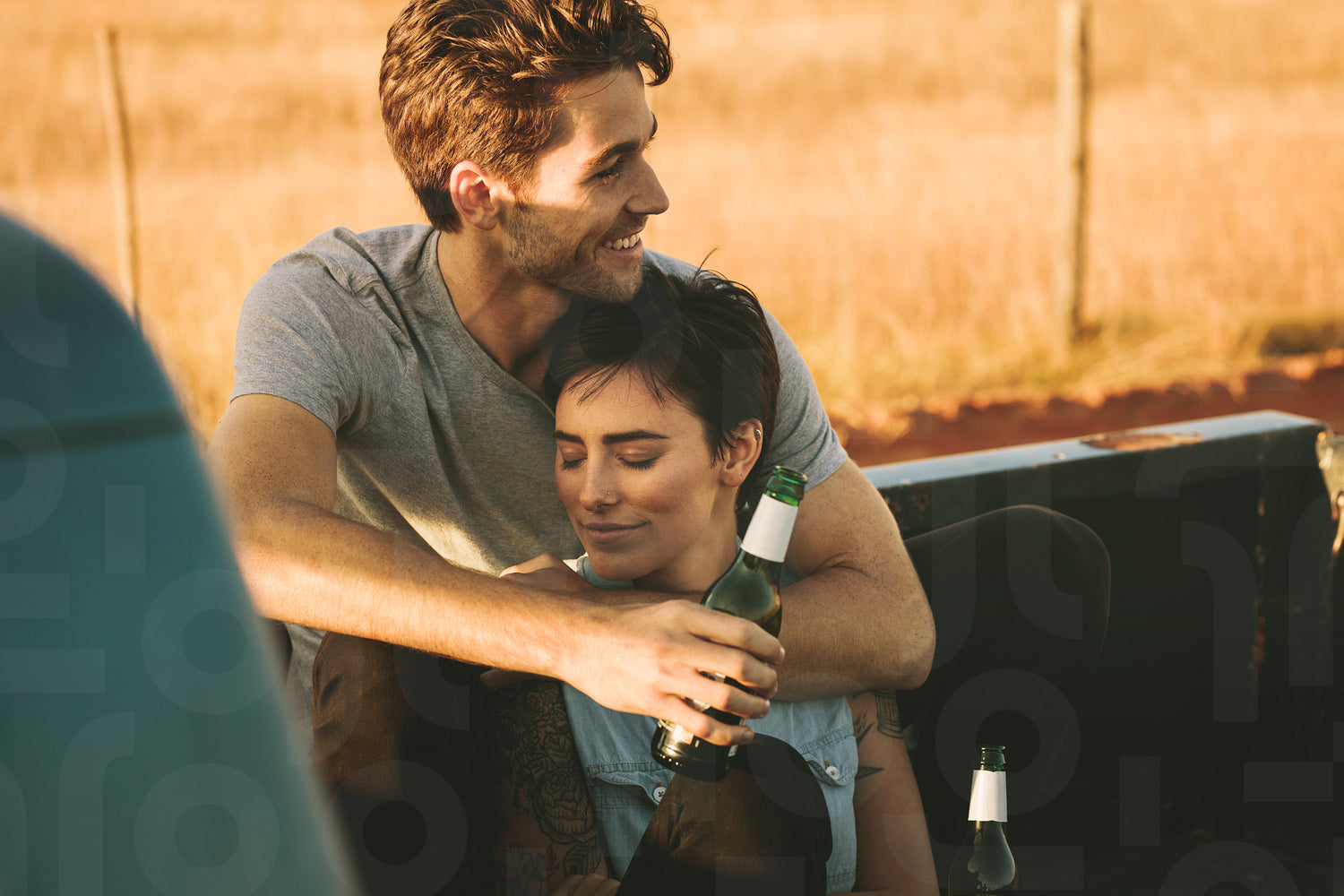Couple sitting in the back of their pickup truck enjoying the road trip in country side. Woman sitting with eyes closed while the man holds her in his arms from behind.