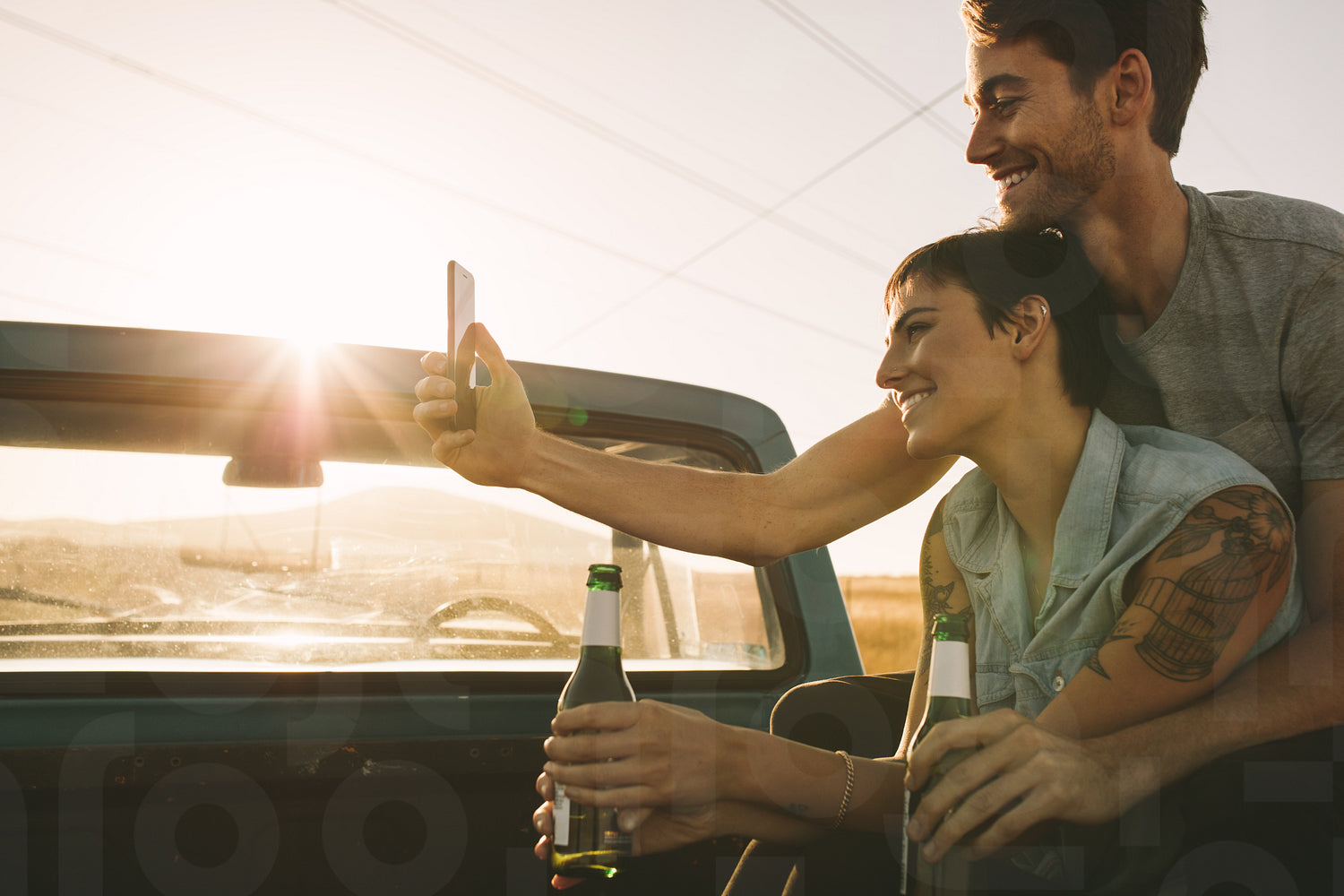 Close up of couple taking a selfie using mobile phone sitting at the back of their pick up truck. Cheerful couple sitting in the back of their pickup truck enjoying the road trip in country side.