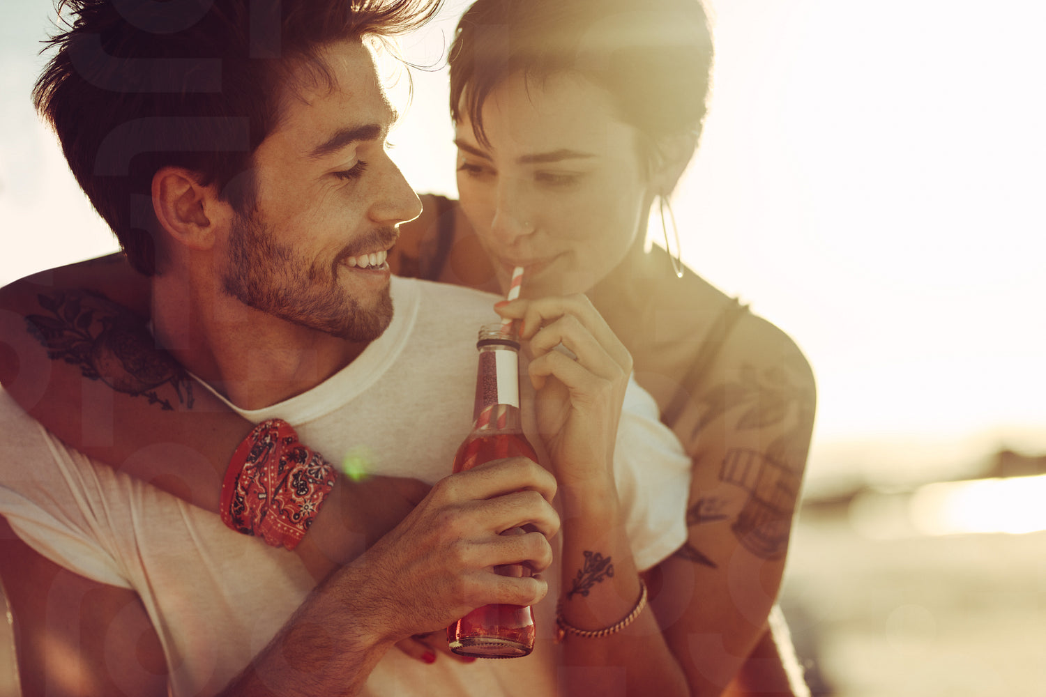 Handsome young man piggybacking his girlfriend outdoors. Woman drinking beverage while carried by her boyfriend.