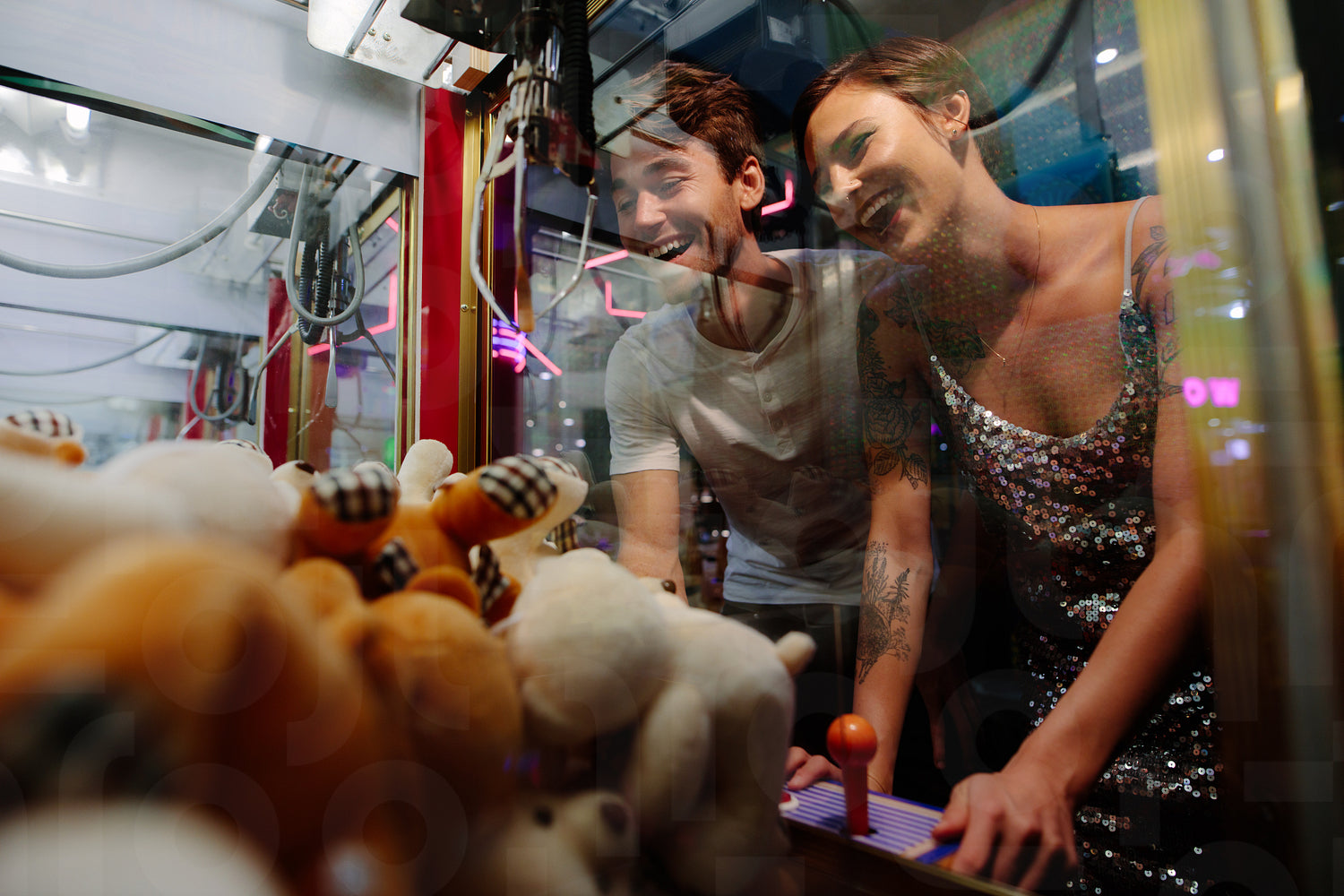 Smiling couple playing coin operated games at a gaming parlour. Happy man and woman having fun at a gaming arcade playing games.