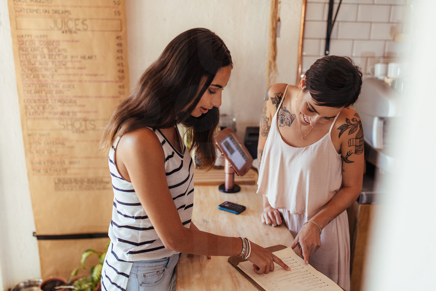 Restaurant owner helping a customer with the menu. Customer ordering food looking at the menu at the billing counter.