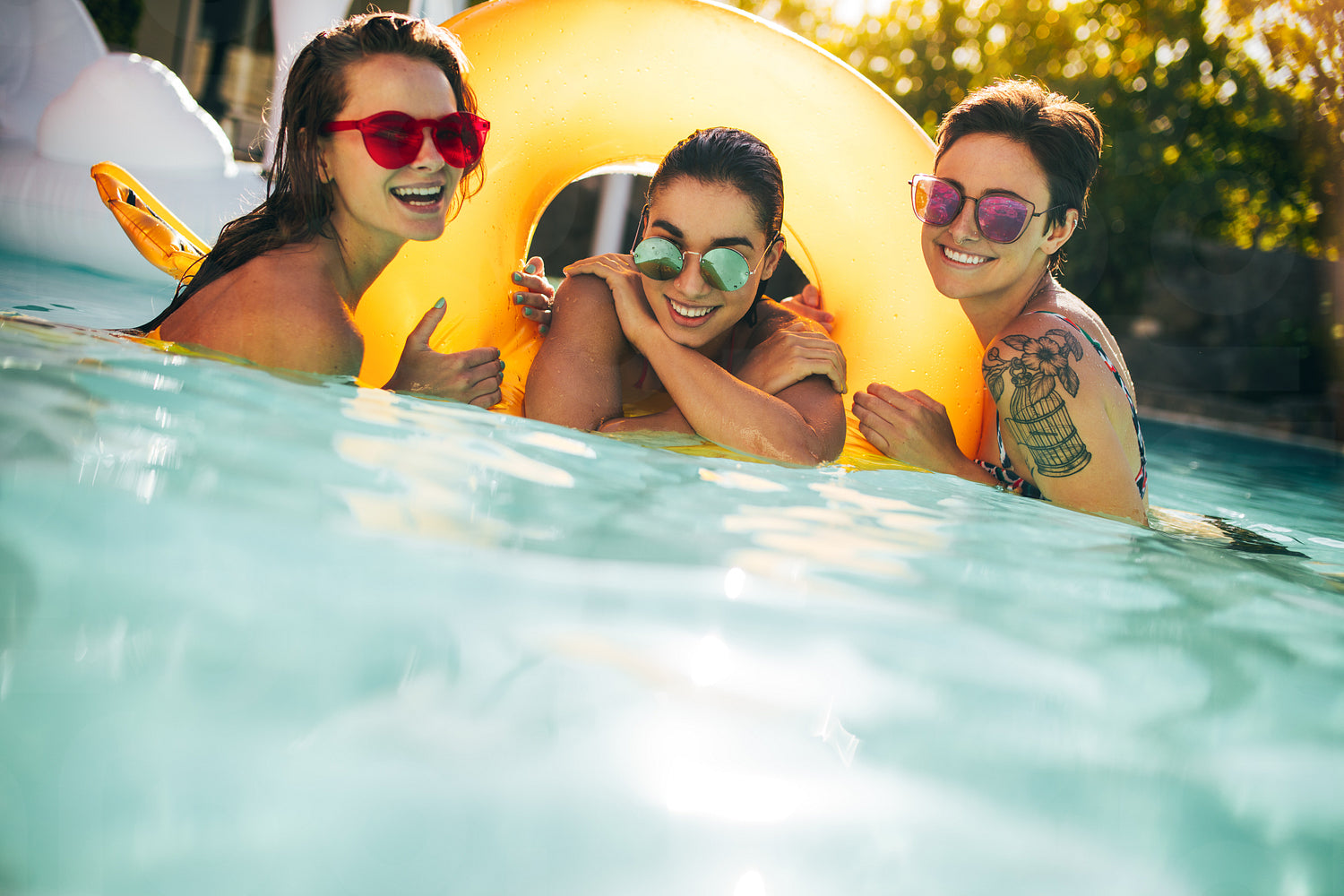 Portrait of beautiful women together in pool with a floating ring. Female friends having fun in a swimming pool.