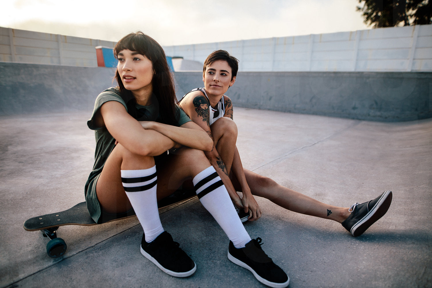 Two young women sitting on long board and looking away. Female friends sitting relaxed at skate park.