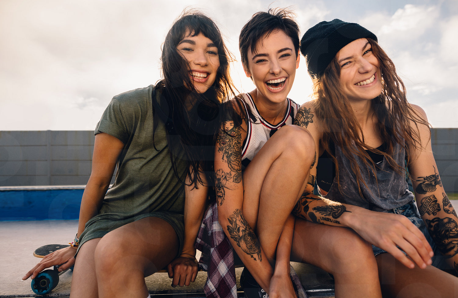 Portrait of three female skater having great time outdoors. Group of women sitting at skate park and laughing.