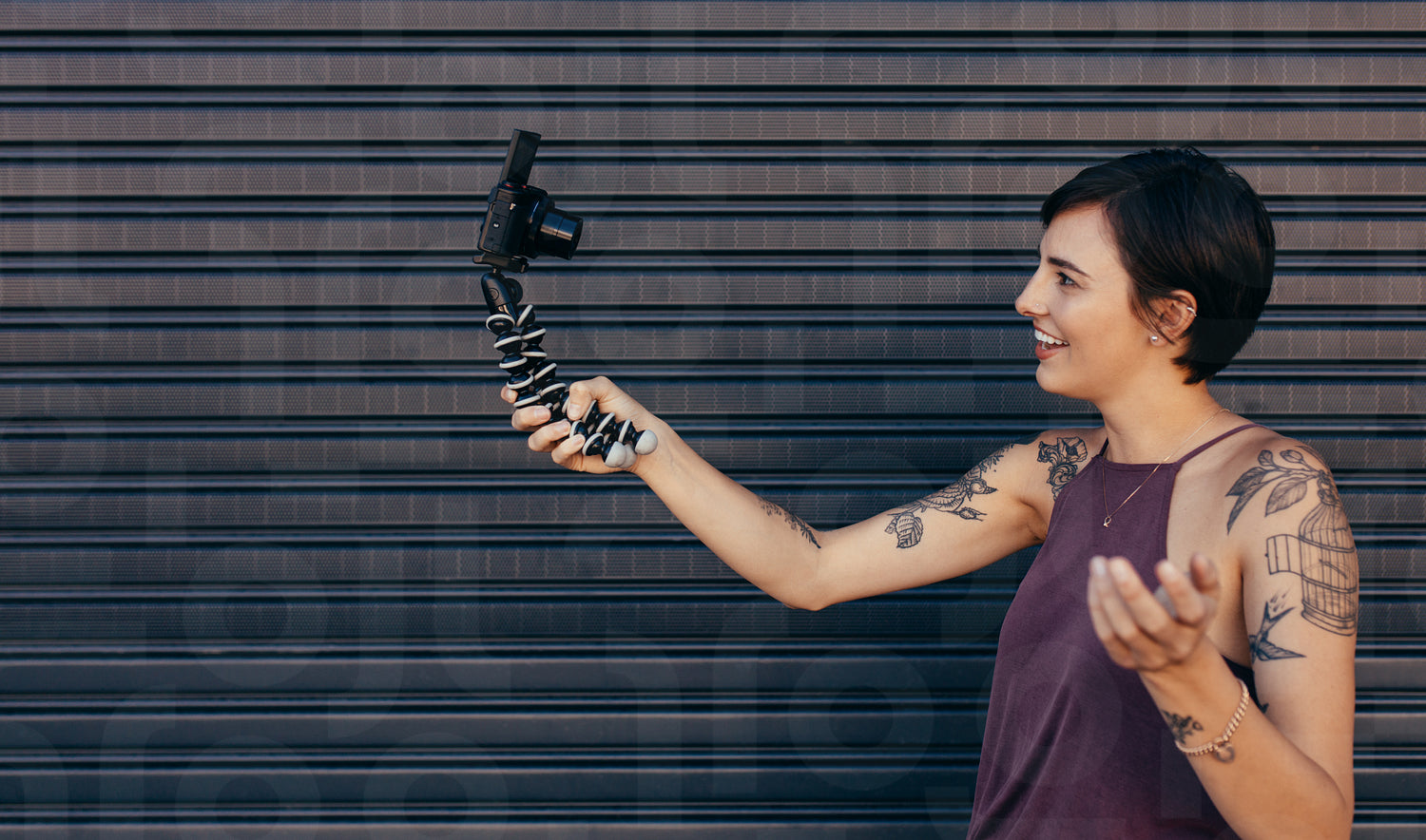 Tattooed woman vlogger recording her vlog content on a digital camera mounted on flexible tripod. Female making a video blog outdoors.