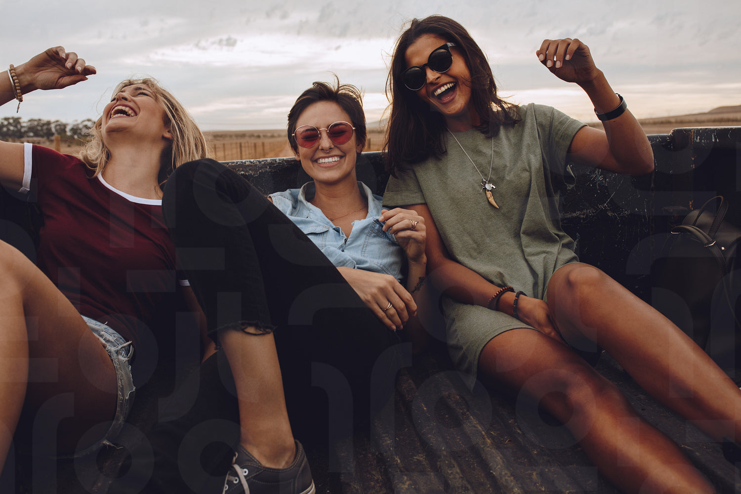 Portrait of happy young friends sitting in a pickup truck going on a road trip. Young people enjoying a country road ride.