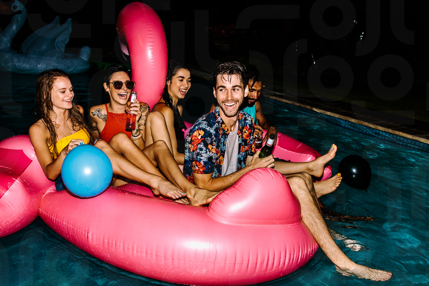 Group of men and women having fun and laughing on an inflatable flamingo pool float mattress. Cheerful friends hanging out in a pool in evening. Evening pool party.