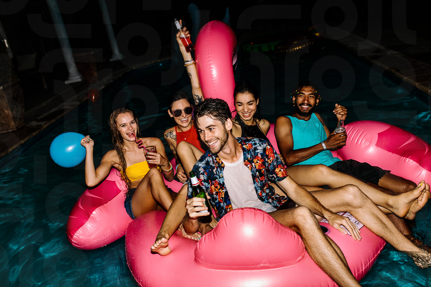 Group of men and women having beers on an inflatable pool float mattress in evening. Friends hanging out together in a pool party.